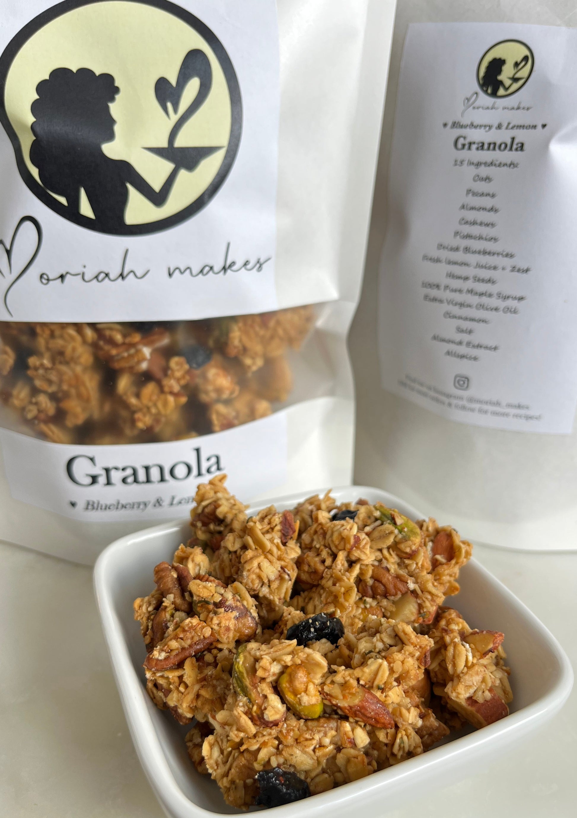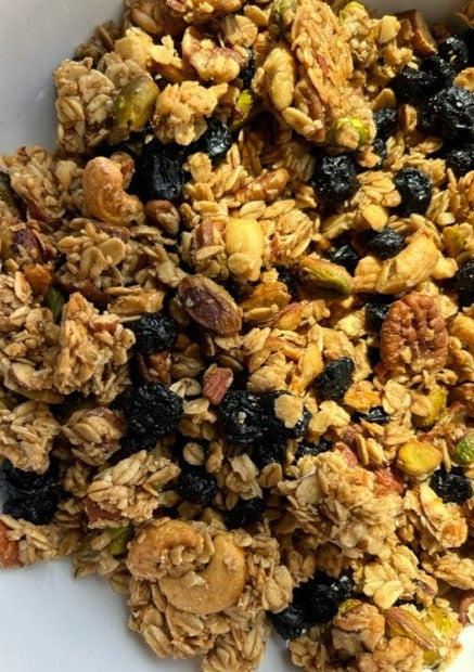 Oats, Pecans, Almonds, Cashews, Pistachios, Dried Blueberries, Lemon Juice + Zest, Hemp Seeds, Honey, Maple Syrup, Olive Oil, Almond Extract, Cinnamon, Allspice, Salt.