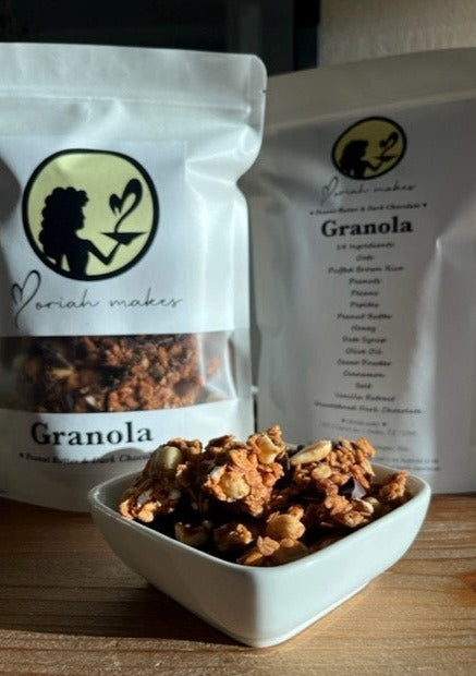 Oats, Puffed Brown Rice, Peanuts, Pecans, Pepitas, Peanut Butter, Honey, Date Syrup, Olive Oil, Vanilla Extract, Cacao Powder, Cinnamon, Salt, Unsweetened Dark Chocolate.